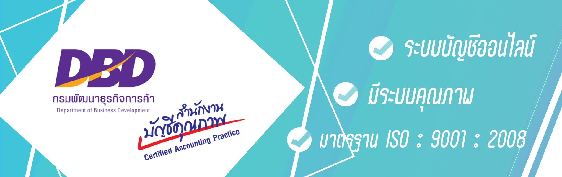 เราได้รับหนังสือรับรองคุณภาพจากกรมพัฒนาธุรกิจการค้า กระทรวงพาณิชย์ ในฐานะผู้ประกอบธุรกิจสำนักงานบัญชีมีการปฏิบัติงานที่มีคุณภาพและเป็นที่น่าเชื่อถือ โดยผ่านการตรวจประเมินการปฏิบัติตามข้อกำหนดการรับรองคุณภาพสำนักงานบัญชี ตามประกาศกรมพัฒนาธุรกิจการค้า