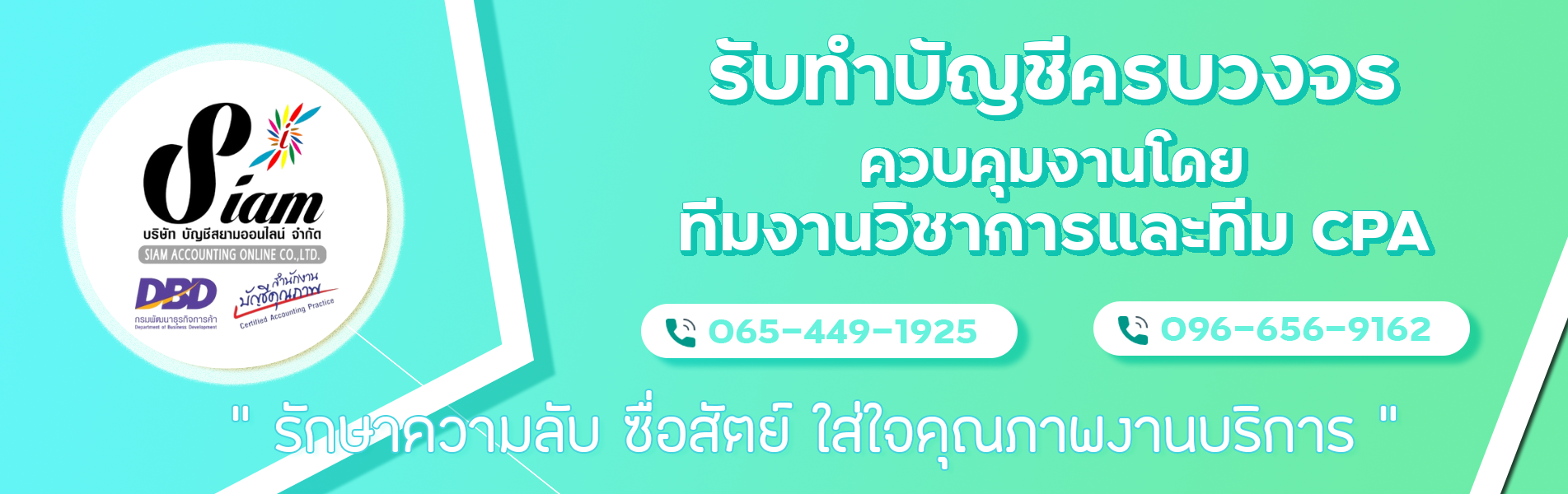 บัญชีสยามออนไลน์ให้บริการรับทำบัญชีในรูปแบบครบวงจรร่วมกับผู้ประกอบการ กิจการจะได้ระบบงานทำบัญชีที่เป็นมาตรฐาน พร้อมกับได้รับข้อมูลงบการเงิน เพื่อนำไปบริหารตัดสินใจ ได้อย่างถูกต้องทันเวลา และเพื่อให้เกิดความมั่นใจในการนำข้อมูลไปใช้ใน การบริหาร กิจการสามารถขอคำปรึกษา หรือความเห็นในส่วนของการวางแผนภาษีอากร การบริหารการเงินจากผู้เชี่ยวชาญประจำสำนักงานได้